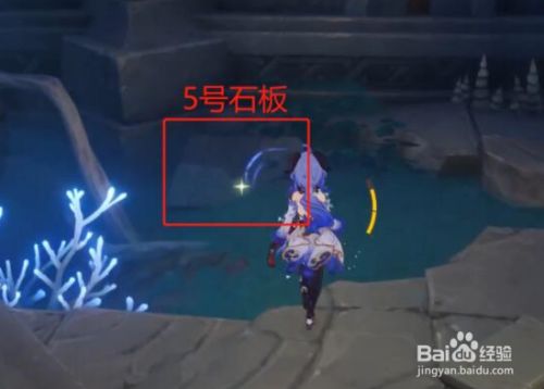 第五块石板位于正视通俗宝箱的左手边水池中。