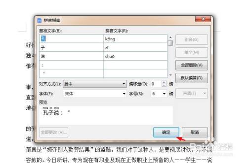 第四步:如下图所示,弹出“拼音指南”对话框,按照需要设置拼音的对齐体例和字体,设置完当作后,单击“确定”按钮。