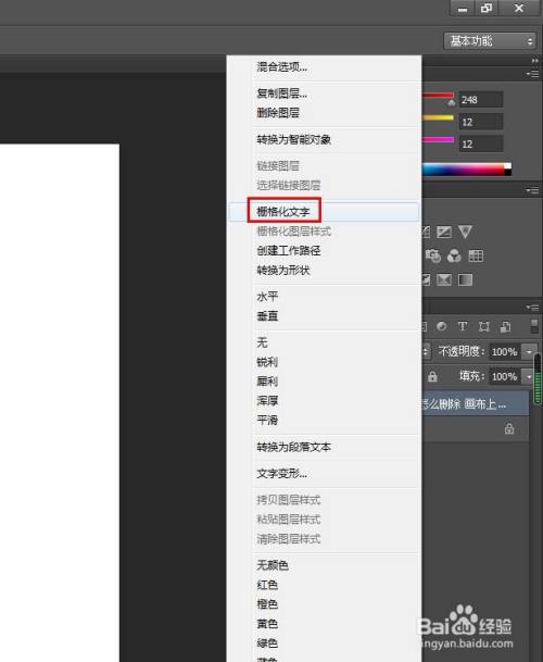 第二步:选中文字图层,单击鼠标右键,选择栅格化文字选项。