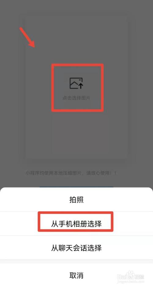 在小程序页面点击上传图片,在弹出的菜单中点击从相册中选择,选择想要压缩的照片。