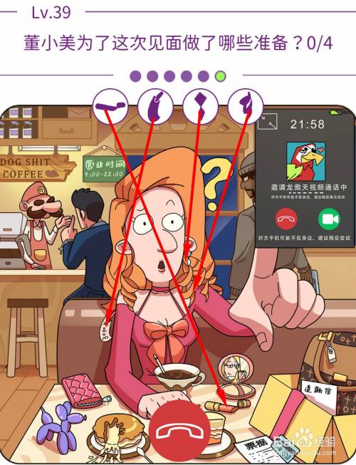 需要选择4样物品,别离点击董小美衣服上没摘下来的价签,耳朵上的耳饰,卷卷的头发,以及桌子上的口红。