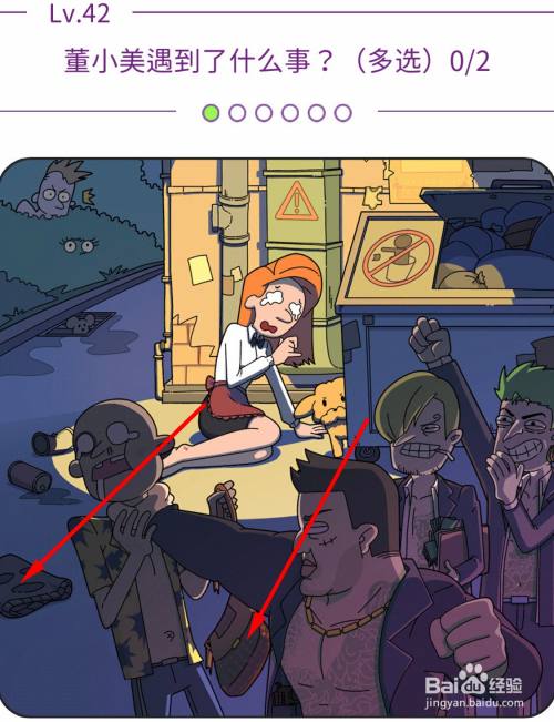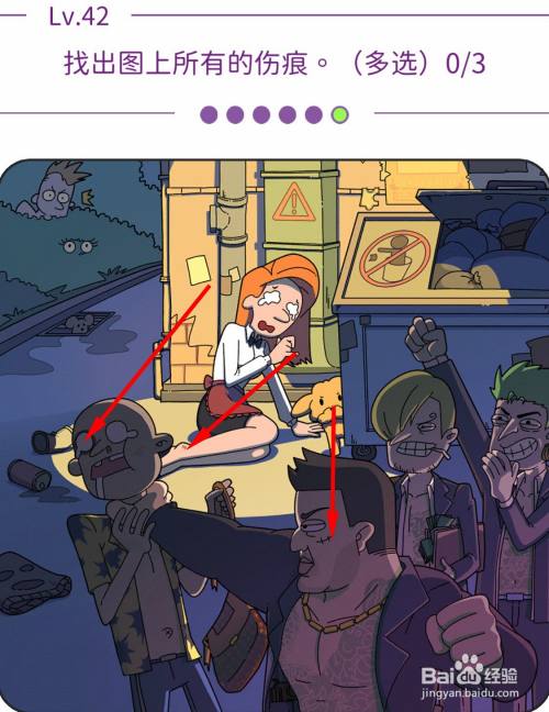 需要选择4样物品,别离点击草丛中躲着的人,草丛中露出的一双眼睛,下水道口的老鼠,垃圾桶后面的狗。