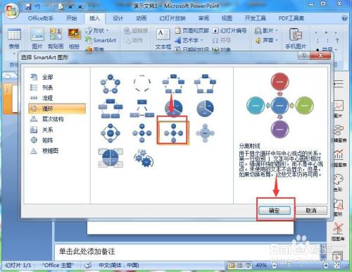 在选择smartart图形页面找到轮回类别,点击分手射线后按确定;