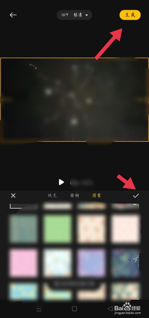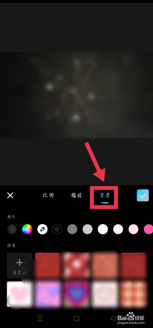 在东西栏中点击布景选项,选择喜好的视频布景图案后点击打勾并生当作。