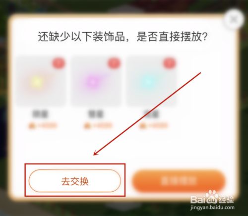 接着,点击【0摆放图纸】,会显示还贫乏以下装饰品,是否直接摆放,选择【去互换】;