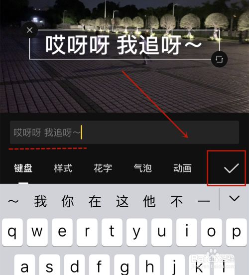 键盘输入文字后,例:“哎呀呀,我追呀”,点击【√】;