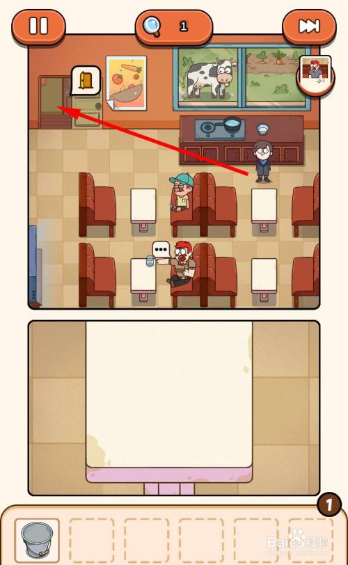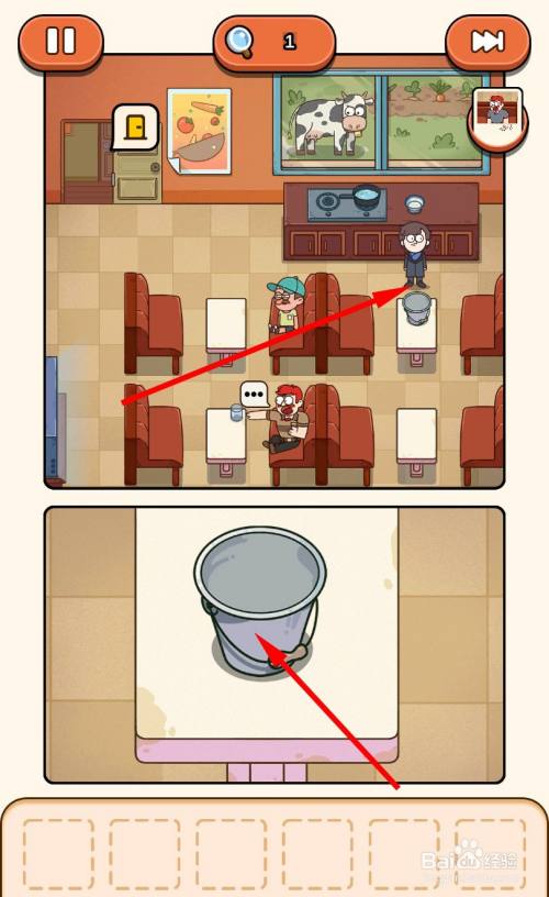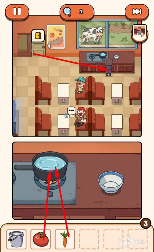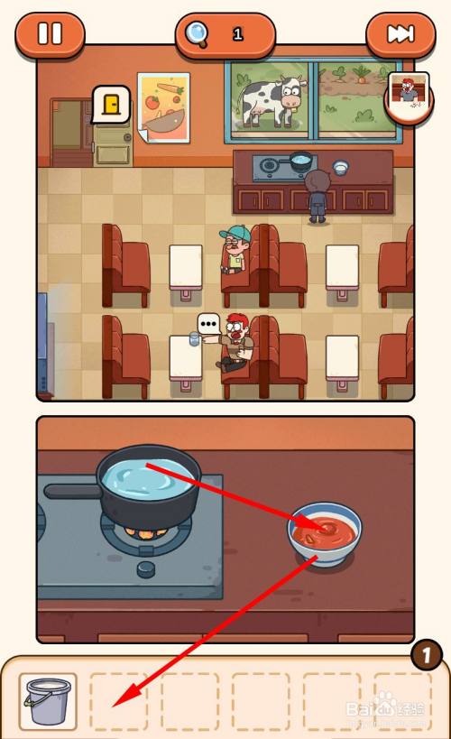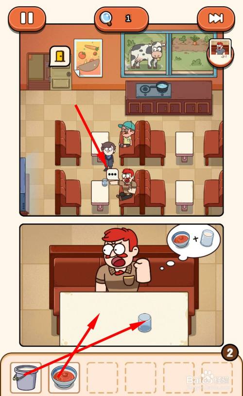 将打真人移动到红发客人身边,将蔬菜汤放到桌上,再将牛奶倒入杯中即可过关。