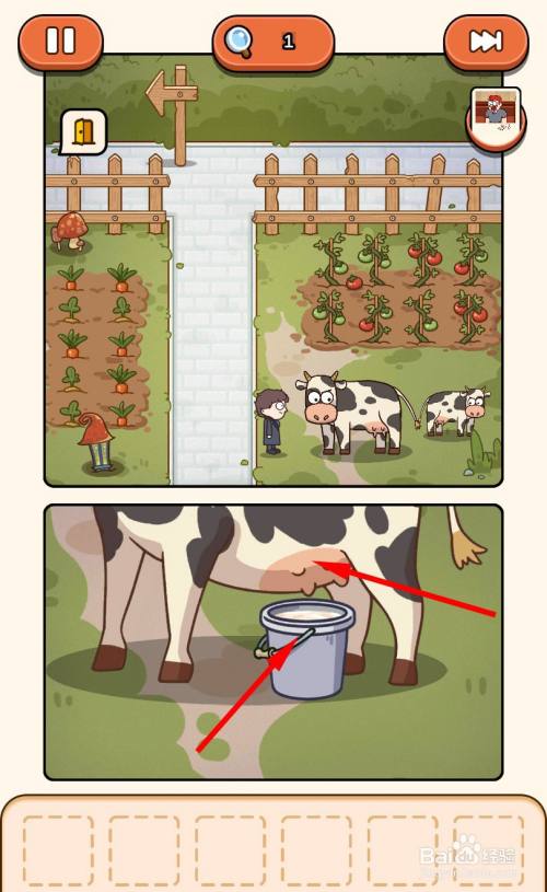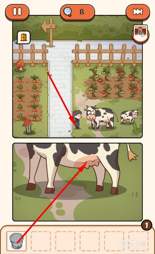 来到菜园后让大侦察走到奶牛旁边,将水桶放到奶牛肚子下面的地上。
