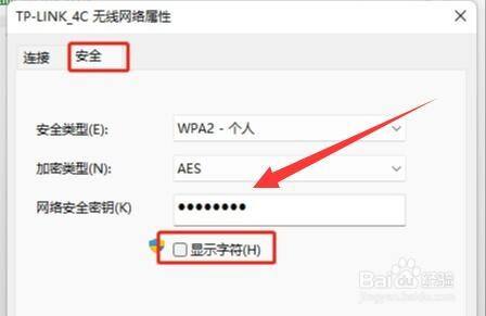 第7步进入“平安”选项,勾选“显示字符”,在“收集平安密钥”中就能看到wifi密码了