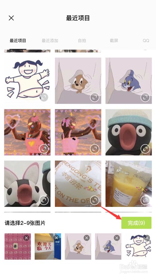 选择将要拼当作九宫格的九张图片,点击完当作。