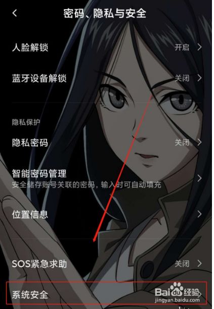 3、进入页面后,点击最下方的密码、隐私与平安。
