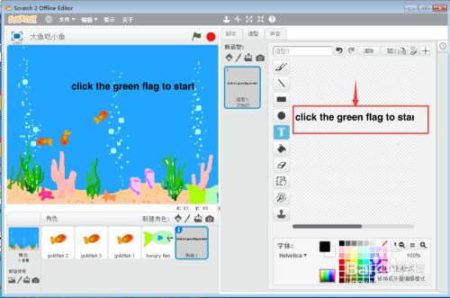 在光标处输入对用户的指导提醒语click the green flag to start;