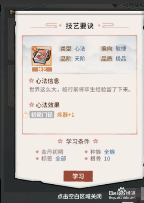 肆意境界、根骨(根骨1及以上100%进修当作功)的门生都可以进入修炼房进修该心法。