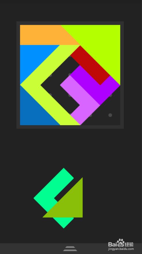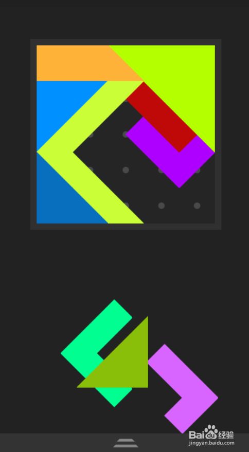 最后在粉色外形的右下侧,放上茶青色三角形挨着,如图,这样就通关了。