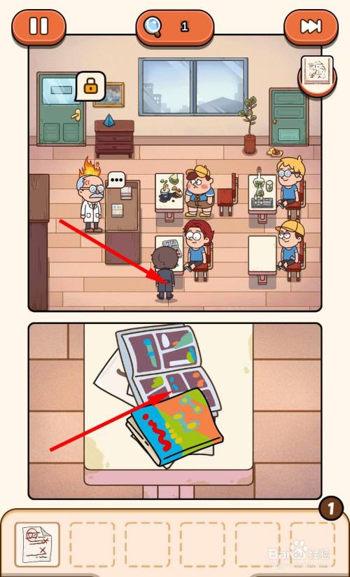 走到第一排靠下的座位旁边,点击课桌上的书,可以看到试卷碎片。