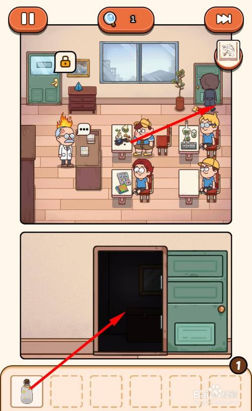 走到教室后门,打开后门,将瓶子放到漆黑的房间里。