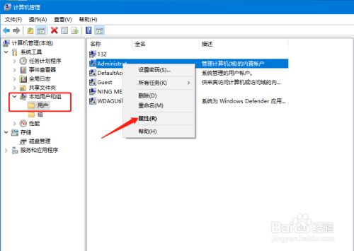 选择当地用户和组,点击用户,之后选择需要添加的办理员账户,右击选择属性。