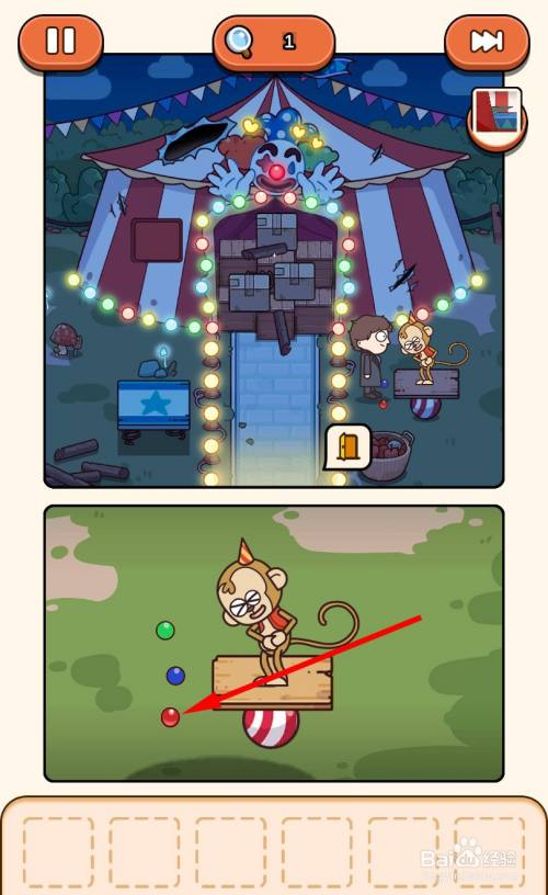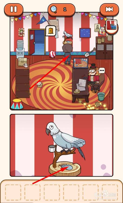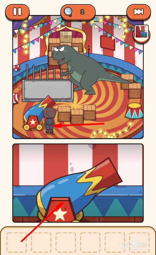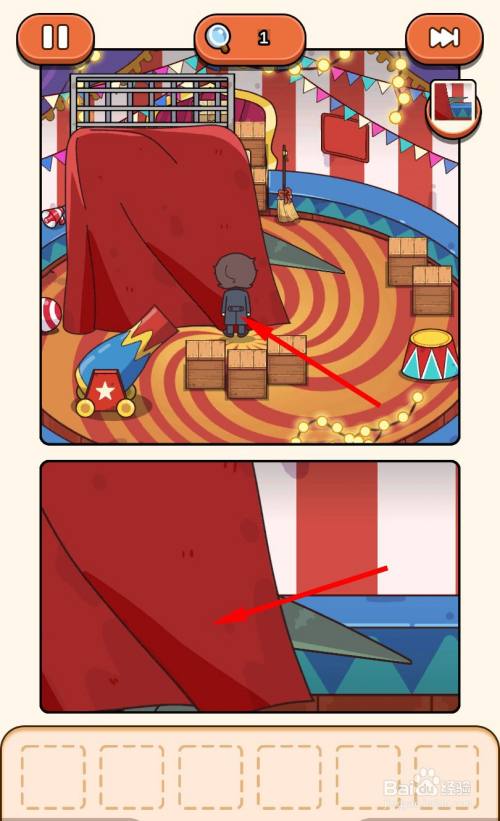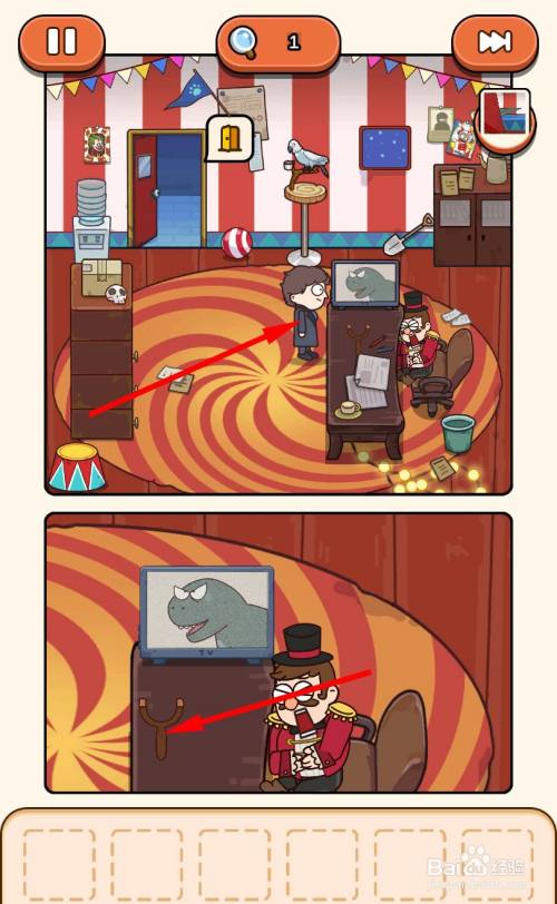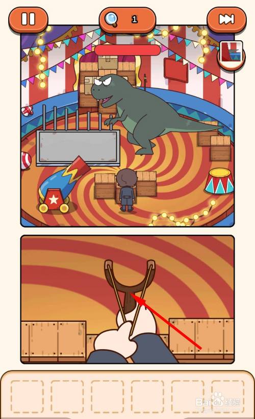 再次经由过程跳板来到马戏团帐篷内部,走到三个木箱旁边,将弹弓放在中心的箱子上。