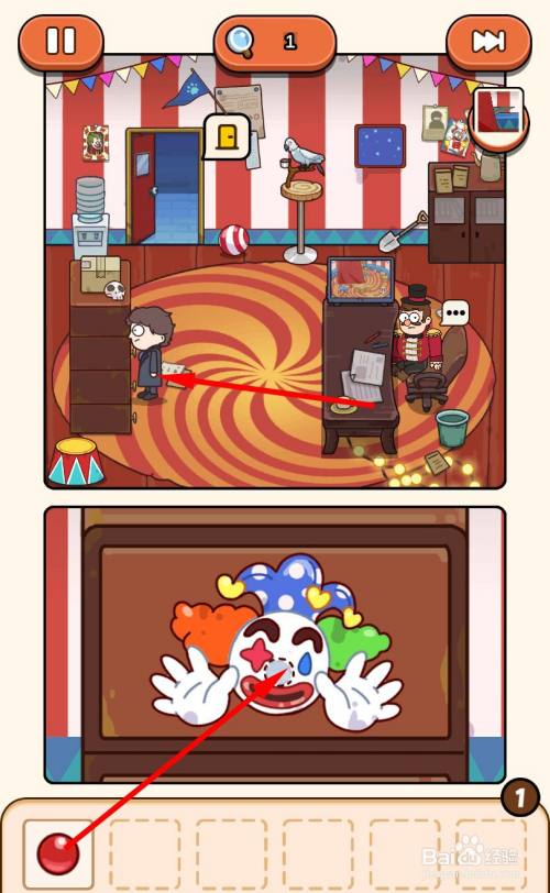 回到屋内,走到左边柜子旁边,将红色小球放在小丑鼻子处。