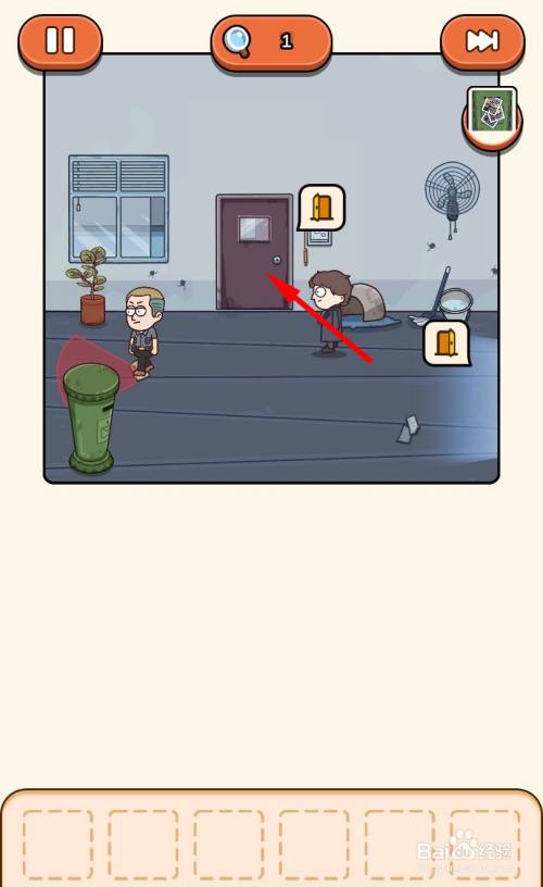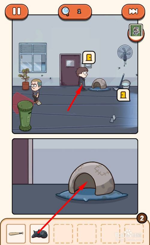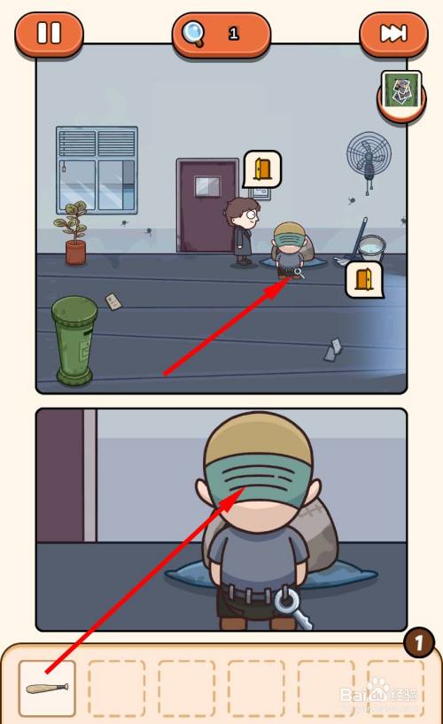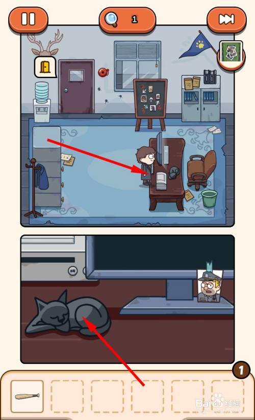 出房间,继续遁藏巡逻的人,走到猫窝旁边,将猫咪放入猫窝。