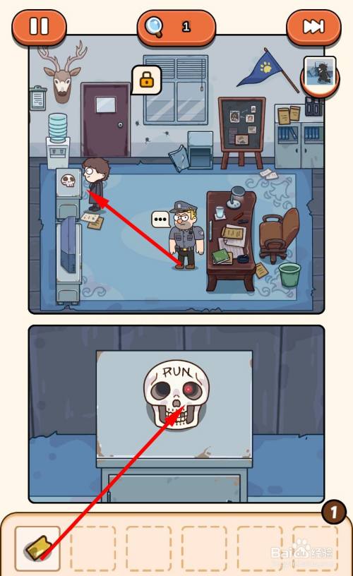 移动到左边的柜子旁边,将金牙放到缺了颗牙头骨的牙洞里,并在头骨上看到 字母RUN。