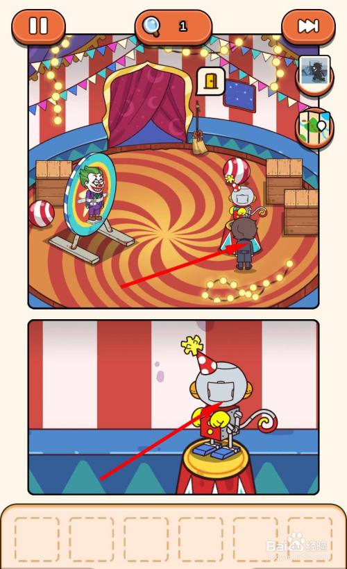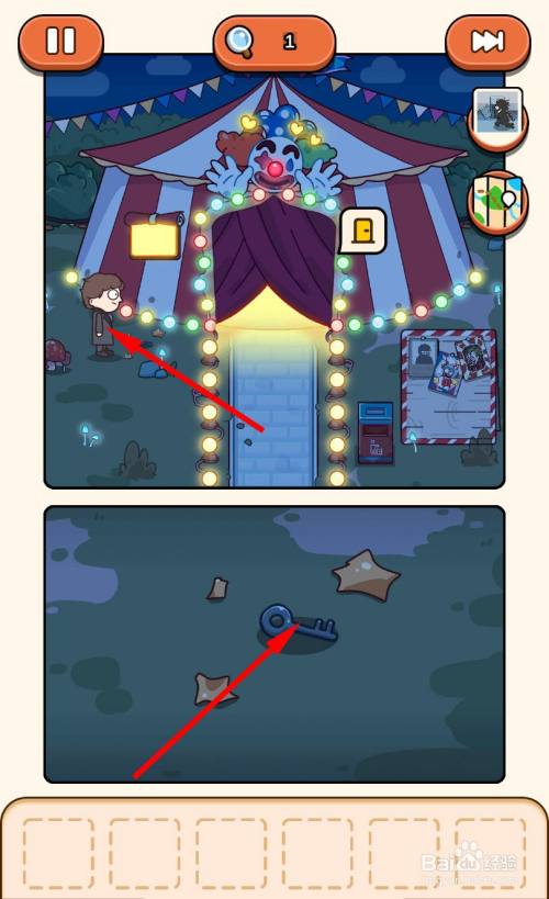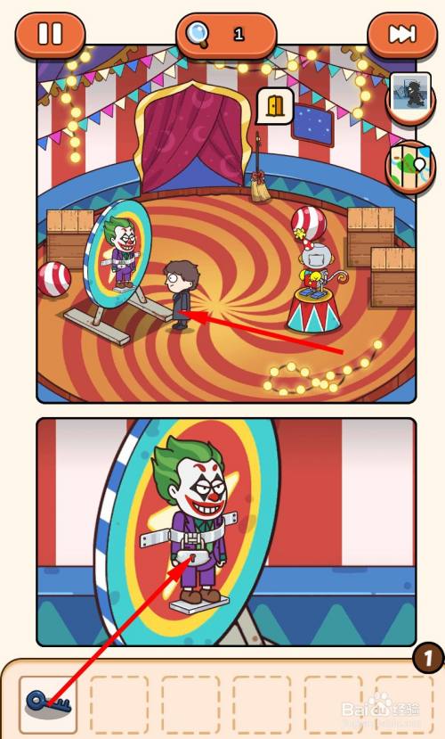 再次回到马戏团帐篷里,走到小丑旁边,用钥匙将锁打开即可过关。