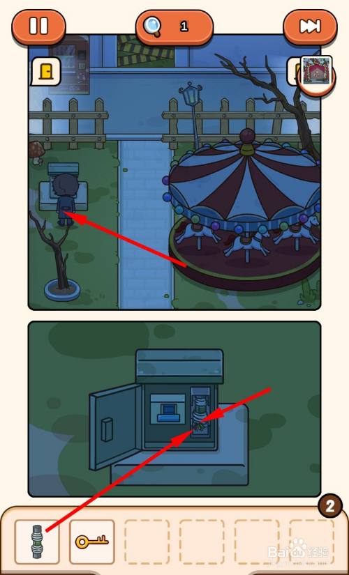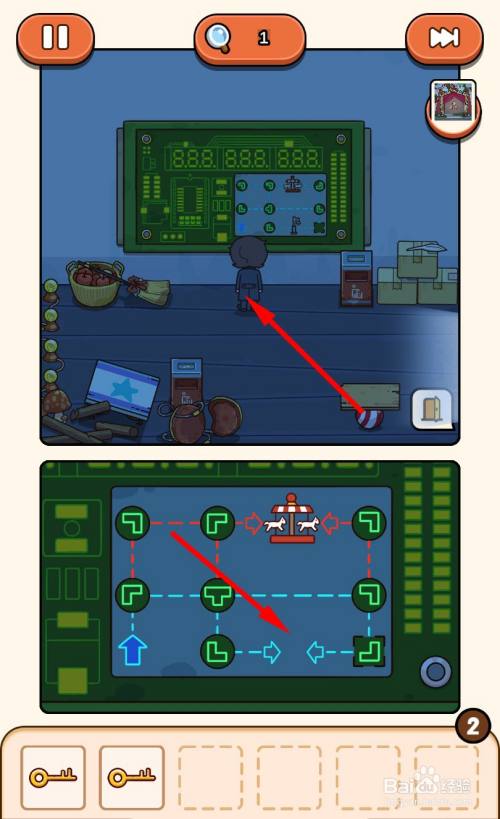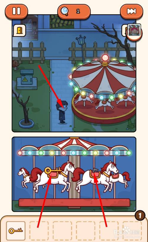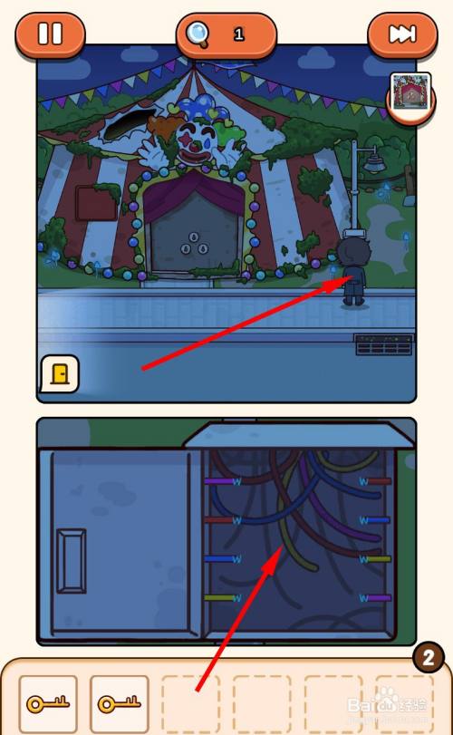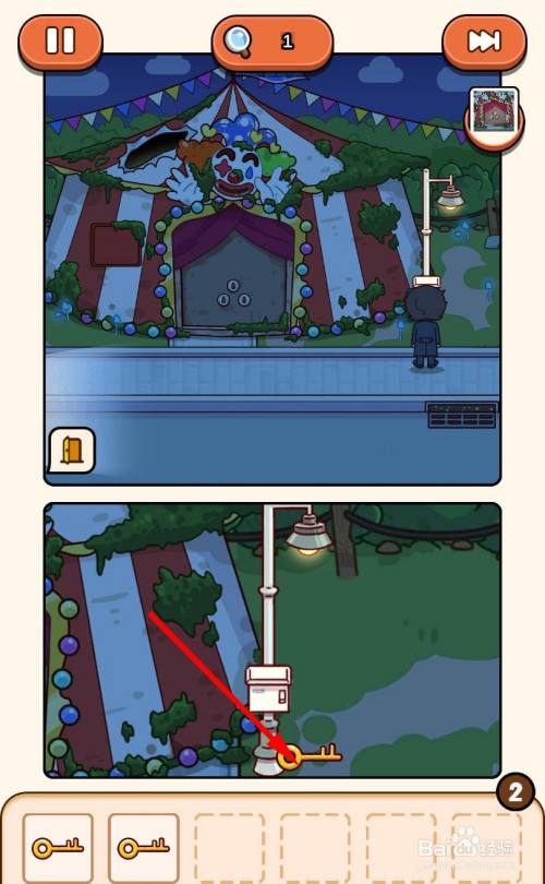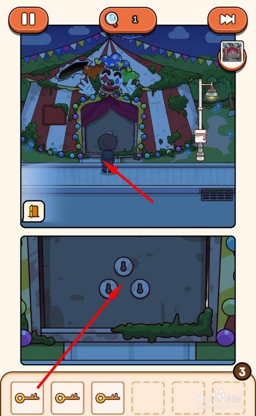 走到马戏团帐篷门口,将3把钥匙插入3个钥匙孔即可过关。
