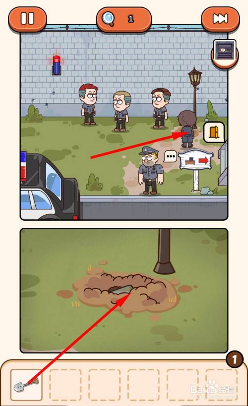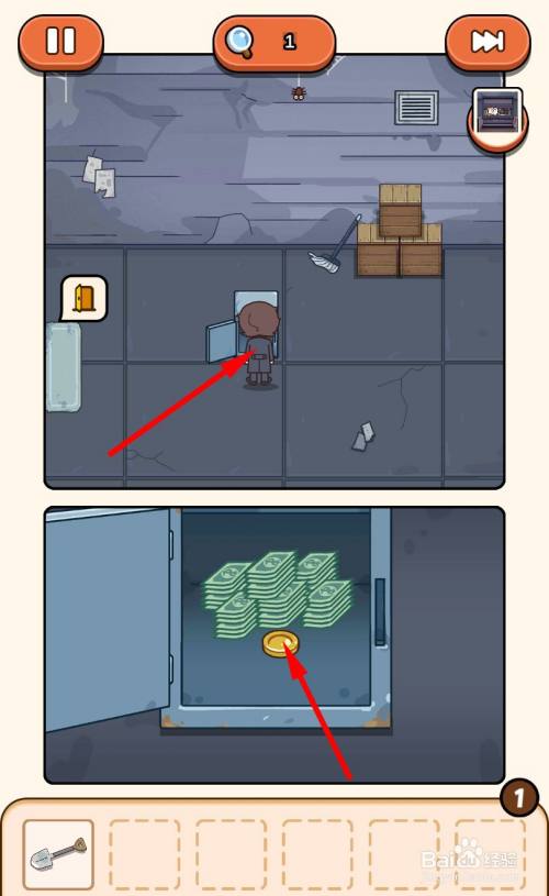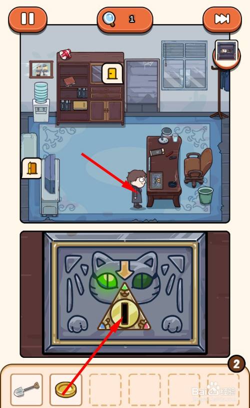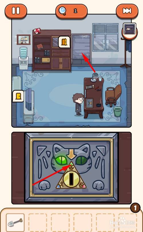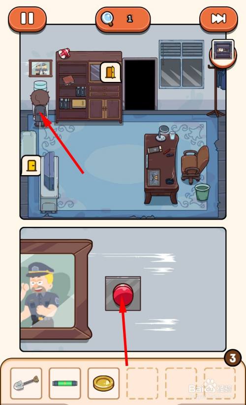 回到屋内,走到饮水机旁边,标的目的左滑动墙上的照片,露出红色按钮,点击按钮打开暗门。