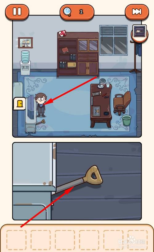 进步前辈入屋内,移动到电视柜旁边,点击拾取电视柜底下的铁锹。
