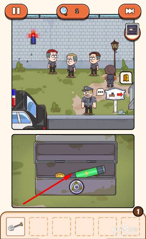 挖出一个铁箱子,打开铁箱子,拿走里面的电池和金币。