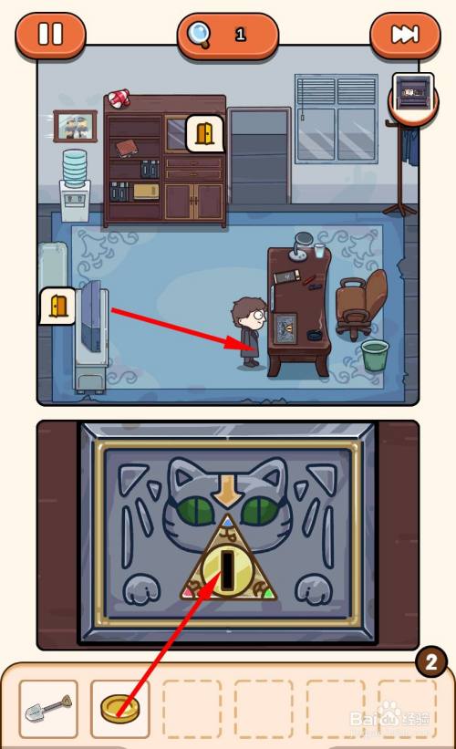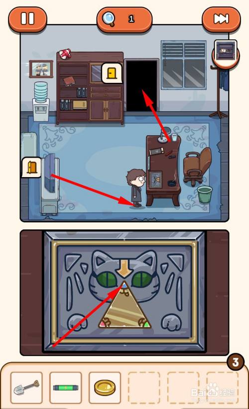 走到办公桌旁边,扭转三角,将蓝色转到猫嘴处,然后走进暗门。