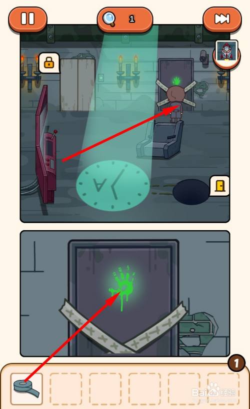 回到操作间,走到被封条封着的门旁,用胶带对着门上的手印利用,即可获得指纹。