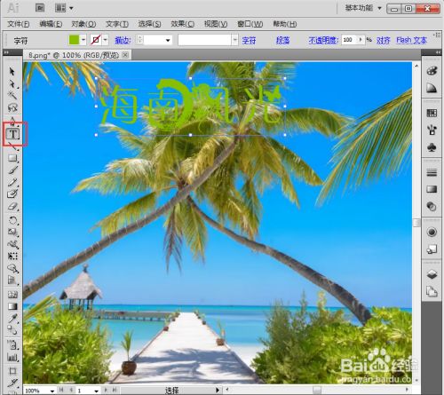 点击文字东西,选择绿色,输入海南风光;