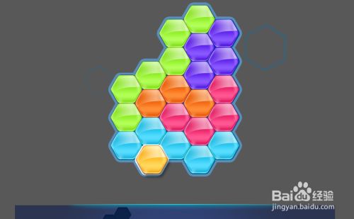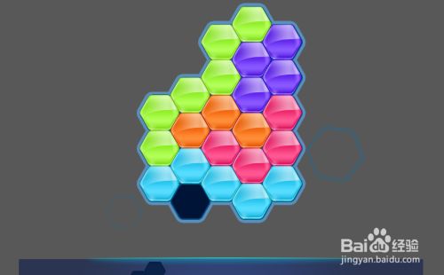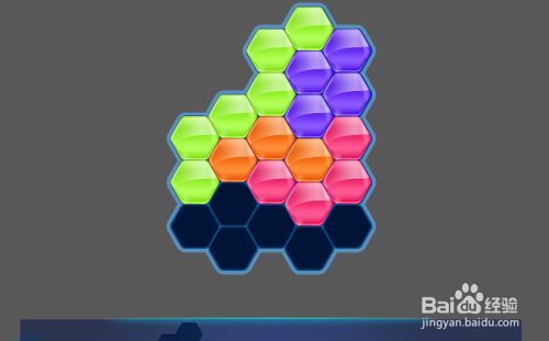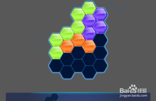 最后在蓝色六边形拼块的下侧,放上黄色六边形拼块挨着,如图,这样就顺遂通关了。