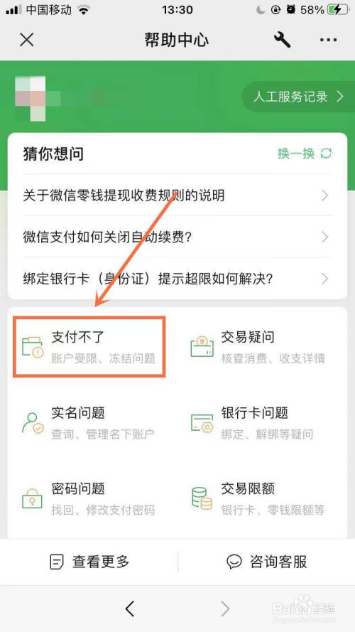 在帮忙中间,点击【支付不了】。