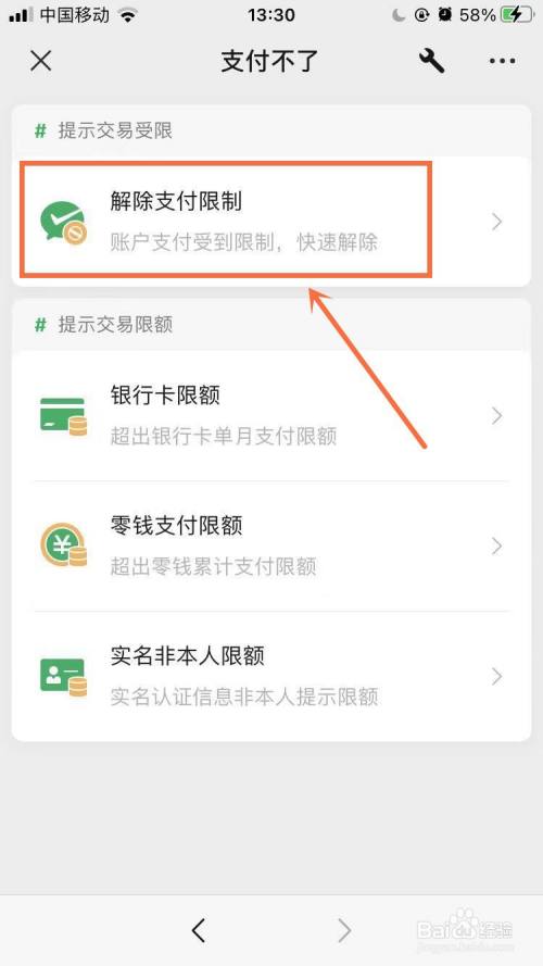 在支付不了界面,点击【解除支付限制】。