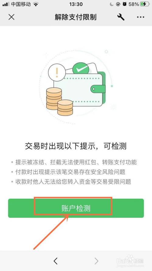 在解除支付限制界面,点击【账户检测】。