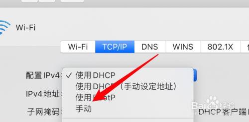 在IP设置选项的设置装备摆设下拉框选择手动选项