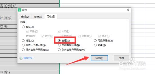 此时将弹出如图所示的定位窗口,在此,我们勾选空值选项,点击定位按钮。