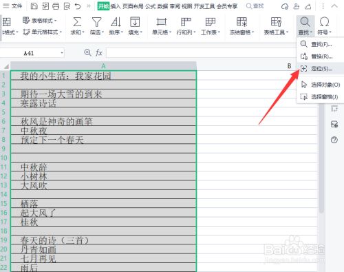 首先,我们可以选中响应的表格区域,点击如图所示的查找下拉列表,从中选择定位选项。