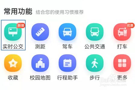 点击出行今后就会弹出下图所示的常用功能窗口,窗口中就能找到“及时公交”这个新功能;