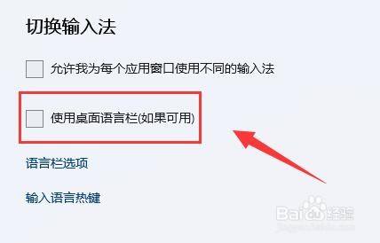5、看到此中的“切换输入法”,打消下方“利用桌面说话栏”