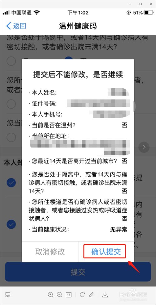 点击提交后,再次查抄确认填写信息,确认信息无误后,点击确认提交,我们就可以申请到温州健康码了,凭健康码进行出行。
