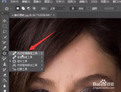 对于此类人脸上痘痘的修复,我们可以选择东西列表中的污点修复画笔东西