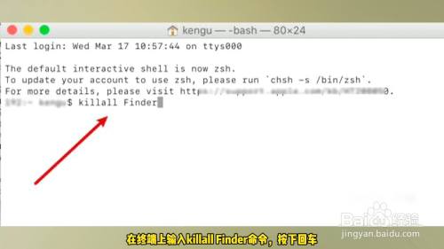 在终端上输入killall Finder号令,按下回车。