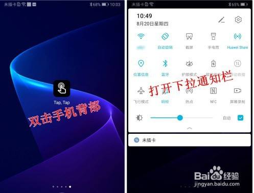 设置完当作后就可以利用了。按照我之前的设置,当我双击手机背部时就会打开下拉通知栏,如下图所示: