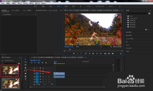 长按鼠标左键,将左侧导入的视频素材拖动到右侧时候轴上面。