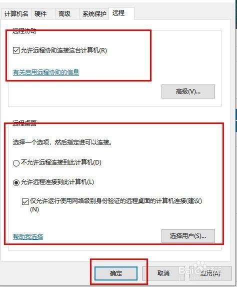 4、点击“长途”勾选“许可长途协助毗连这台计较机”和“许可长途毗连到此计较机”点击“确定”。