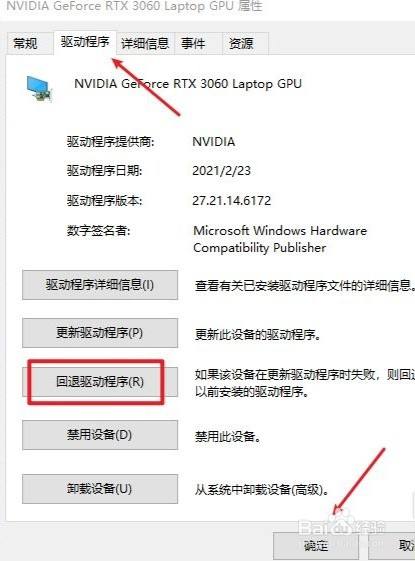 在弹出的窗口中,点击“回退驱动程序”选项,并点击“确定”即可。