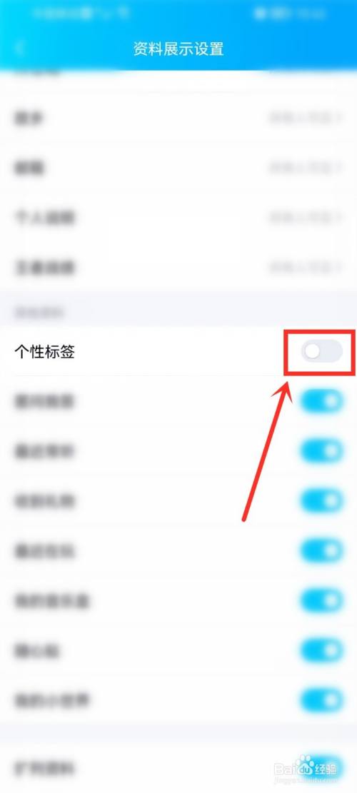 进入资料展示设置,封闭“个性签名”右侧开关,即可封闭个性签名。